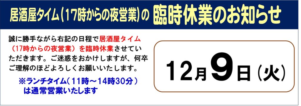 - 夜の居酒屋営業の12月臨時休業のお知らせ誠に勝手ながら下記の日程で、17時からの居酒屋営業を臨時休業させていただきます。 12月/9日(火) ※ランチ… 続きを読む: 夜の居酒屋営業の12月臨時休業のお知らせ