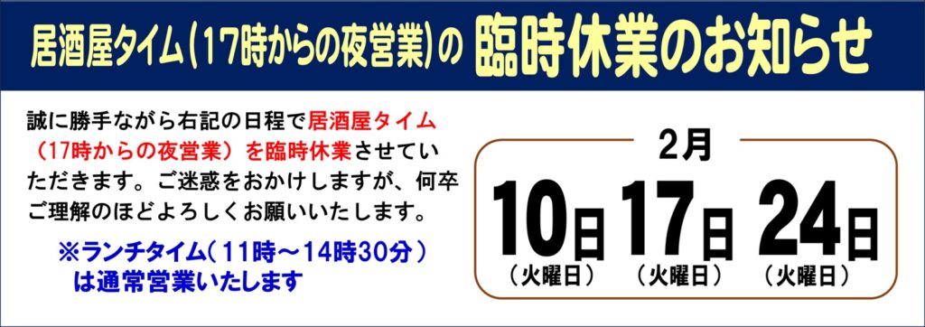 - 夜の居酒屋営業の2026年2月臨時休業のお知らせ誠に勝手ながら下記の日程で、17時からの居酒屋営業を臨時休業させていただきます。 2月/10日(火)・17日(… 続きを読む: 夜の居酒屋営業の2026年2月臨時休業のお知らせ