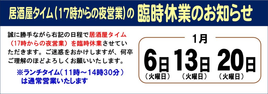 - 夜の居酒屋営業の2026年1月臨時休業のお知らせ誠に勝手ながら下記の日程で、17時からの居酒屋営業を臨時休業させていただきます。 1月/6日(火)・13日(火… 続きを読む: 夜の居酒屋営業の2026年1月臨時休業のお知らせ