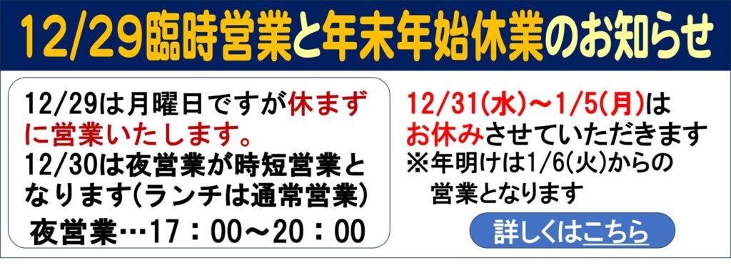 - 2025年末・2026年始の営業につきまして12/29は月曜日(通常、月曜日は定休日)ですが、休まずに通常営業を致します。 12/30(火)につきましては… 続きを読む: 2025年末・2026年始の営業につきまして