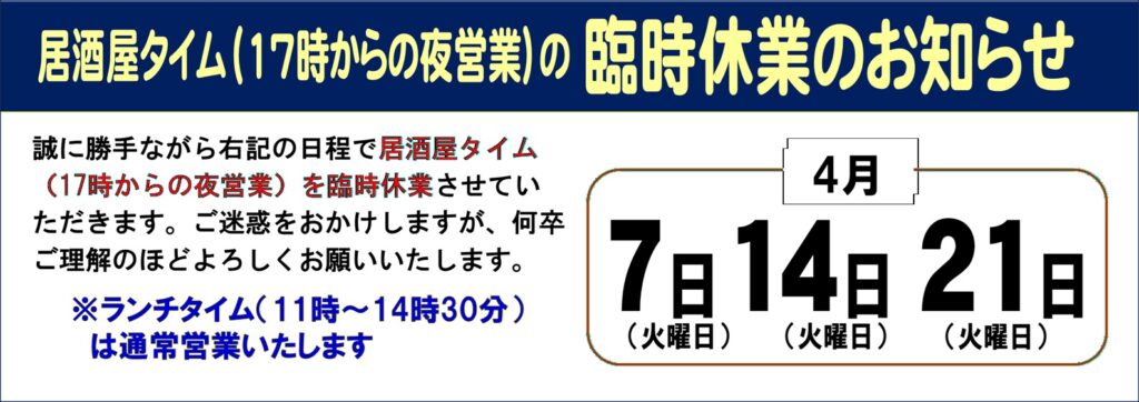 - 夜の居酒屋営業の2026年4月臨時休業のお知らせ誠に勝手ながら下記の日程で、17時からの居酒屋営業を臨時休業させていただきます。 4月/7日(火)・14日(火… 続きを読む: 夜の居酒屋営業の2026年4月臨時休業のお知らせ