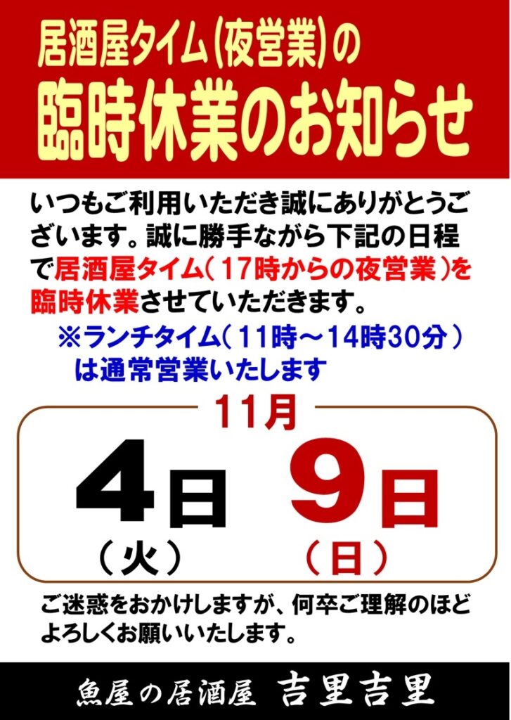 夜の居酒屋営業の11月臨時休業のお知らせ 2025年10月15日 最終更新日時 : 2025年10月15日 izakaya-kirikiri 誠に勝手ながら下記の日程で、17時からの居酒屋営業を臨時休業させていただきます。 11月/4日(火)・9日(日) ※ランチタイム(11:00~14:30)は通常営業いたします。 ご迷惑をおかけしますが、何卒ご理解のほどよろしくお願いいたします。 \ 最新情報をチェック / Bluesky