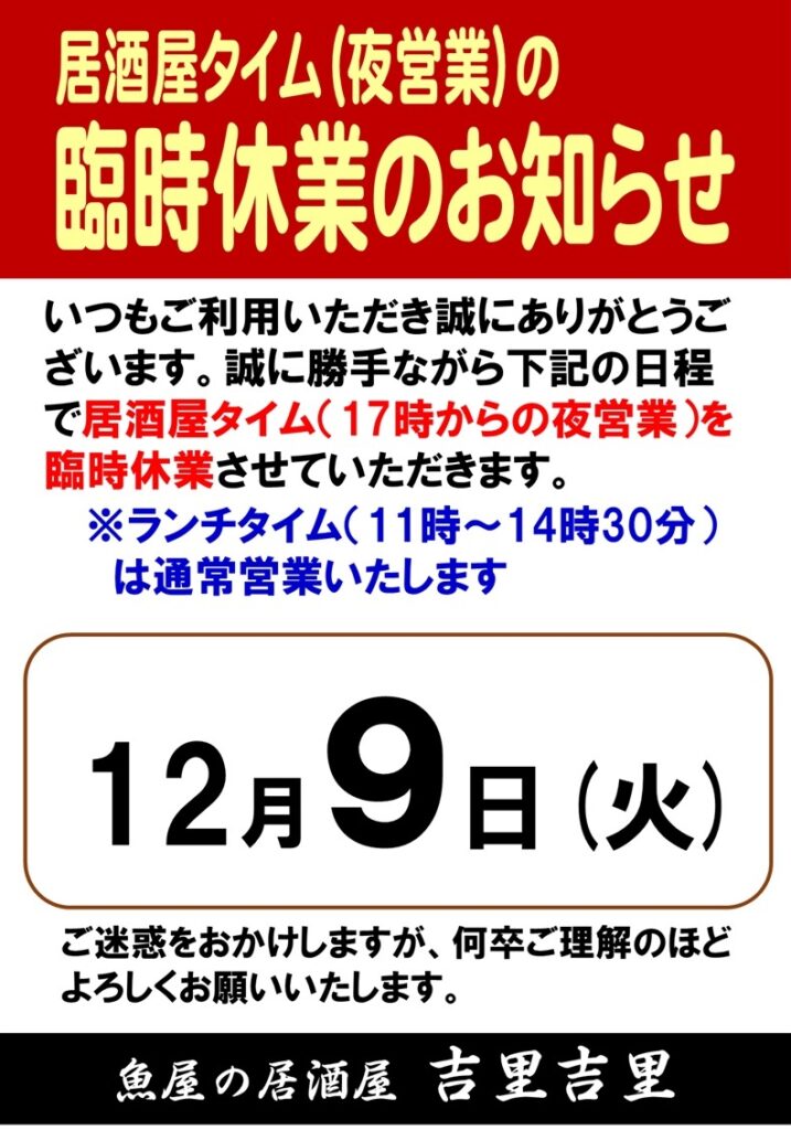 夜の居酒屋営業の12月臨時休業のお知らせ 2025年11月19日 最終更新日時 : 2025年11月19日 izakaya-kirikiri 誠に勝手ながら下記の日程で、17時からの居酒屋営業を臨時休業させていただきます。 12月/9日(火) ※ランチタイム(11:00~14:30)は通常営業いたします。 ご迷惑をおかけしますが、何卒ご理解のほどよろしくお願いいたします。 \ 最新情報をチェック / Bluesky